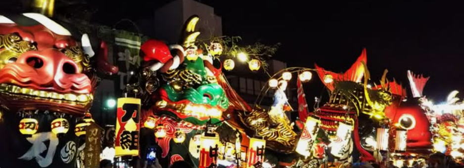 提灯ヤマとも呼ばれ、灯りに照らされた14台の曳山が1年振りに命が吹き返したように輝いて町中を廻ります。