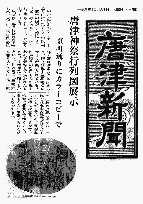 魚屋町西ノ木屋の八代目山内小兵衛均安蔵六が 本町の絵師富野淇園に描かせ、明治十六年に完成 した「唐津神祭絵図襖絵」は、十代目均敬の時、 大正時代に京町の山本表具店で掛け軸に仕立てた。 今でこそ町外のものが大勢ヤマを曳いているが、 当時はあくまでも町民の祭りで、鯛ヤマの上の二の門 のお屋敷にはお供日を恨めしそうに眺めるお姫様まで 描かせ、城内に対して町人の心意気を現している。 鯛ヤマの下には当時の大町年寄の蔵六本人と、 平田屋草場三右衛門、綿屋小島新兵衛を描いている。