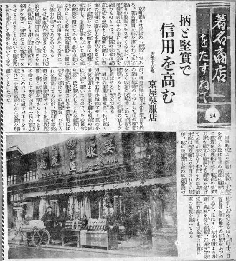 京町通りは唐津の「銀座」である・・・という名文句で始まるこの記事は 今のヤマダイビルの所にあった京屋呉服店の紹介です。 記事にもあるように当主の小川満喜男氏は書に秀で、看板・石碑文字等 各地から依頼されるほどで、中町の竹屋食堂の看板文字も氏の手によるものである。