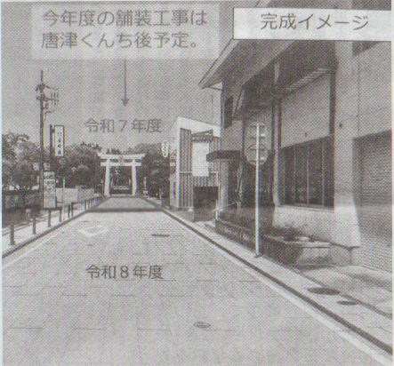 計画では、今年の唐津くんち終了後より第一期の工事を行い、唐津神社前から長崎荘の手前まで。現在建設中の新市民会館前方の道路の舗装改良工事を進め、来年の春季例大祭までに工事を完了し、春の曳山社頭勢揃いの時に曳山と路面の具合を調査。その後、第二期工事として、大手ビル手前まで石畳化の工事が行われるようです。