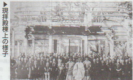 さて、古拝殿とは、読んで字のごとく「古い拝殿」であり、今の拝殿が出来るまで使用されていた「旧拝殿」の事です。旧拝殿は今の境内の中段域にあり、その後方に今の拝殿が建ったことになります。昭和十三年十月九日、旧拝殿より新拝殿へ大神様をお移しする遷座祭が斎行されました。当時の唐津神祭は十月二十九日でしたので、わずか二十日足らずで、旧拝殿を今の場所まで曳家で移動させ、新たに参道を整備して神祭を迎えたことになります。